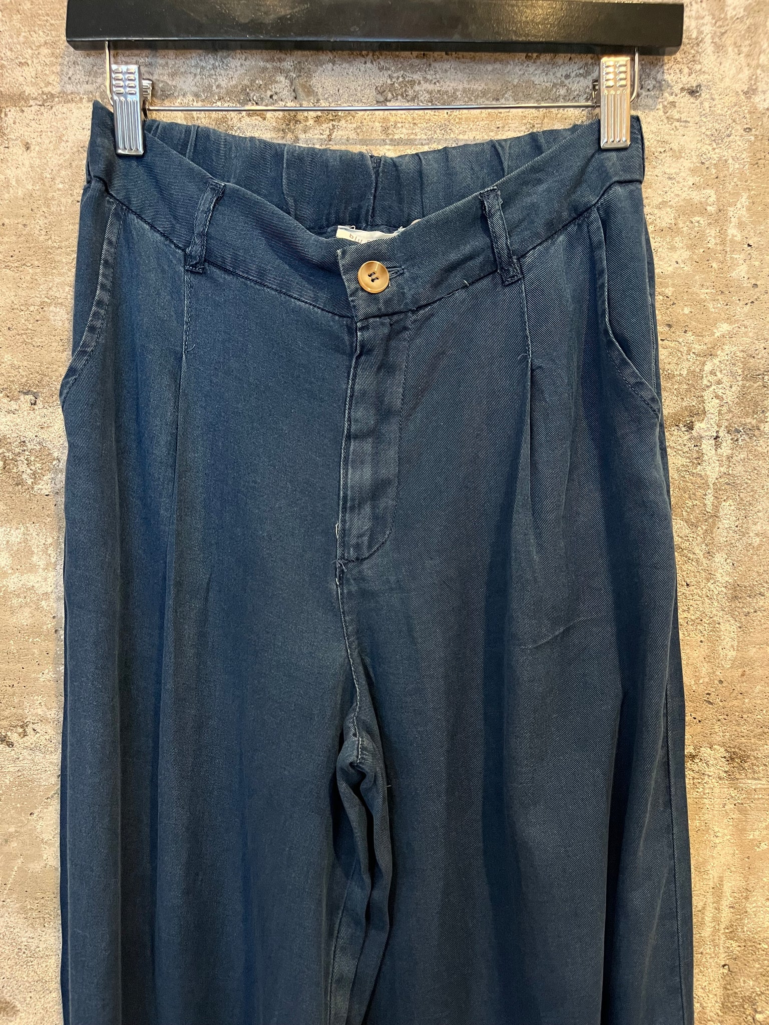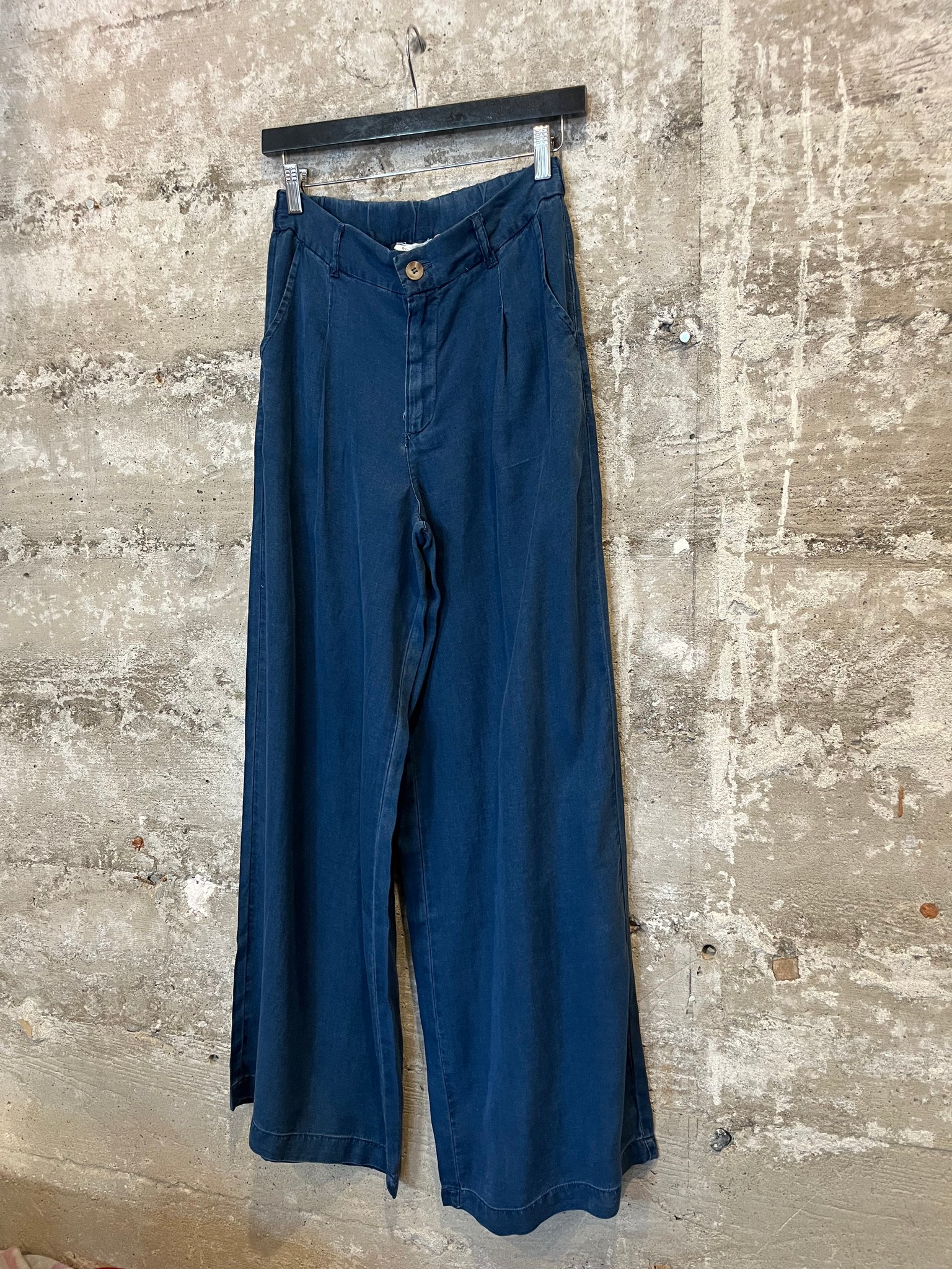 "ARIA". Fashionable and ultra comfy wide-leg chambray pant; relaxed fit on waist; pintuck detail; side pockets and zip button closure;  100% lyocell; featured is a size medium.
